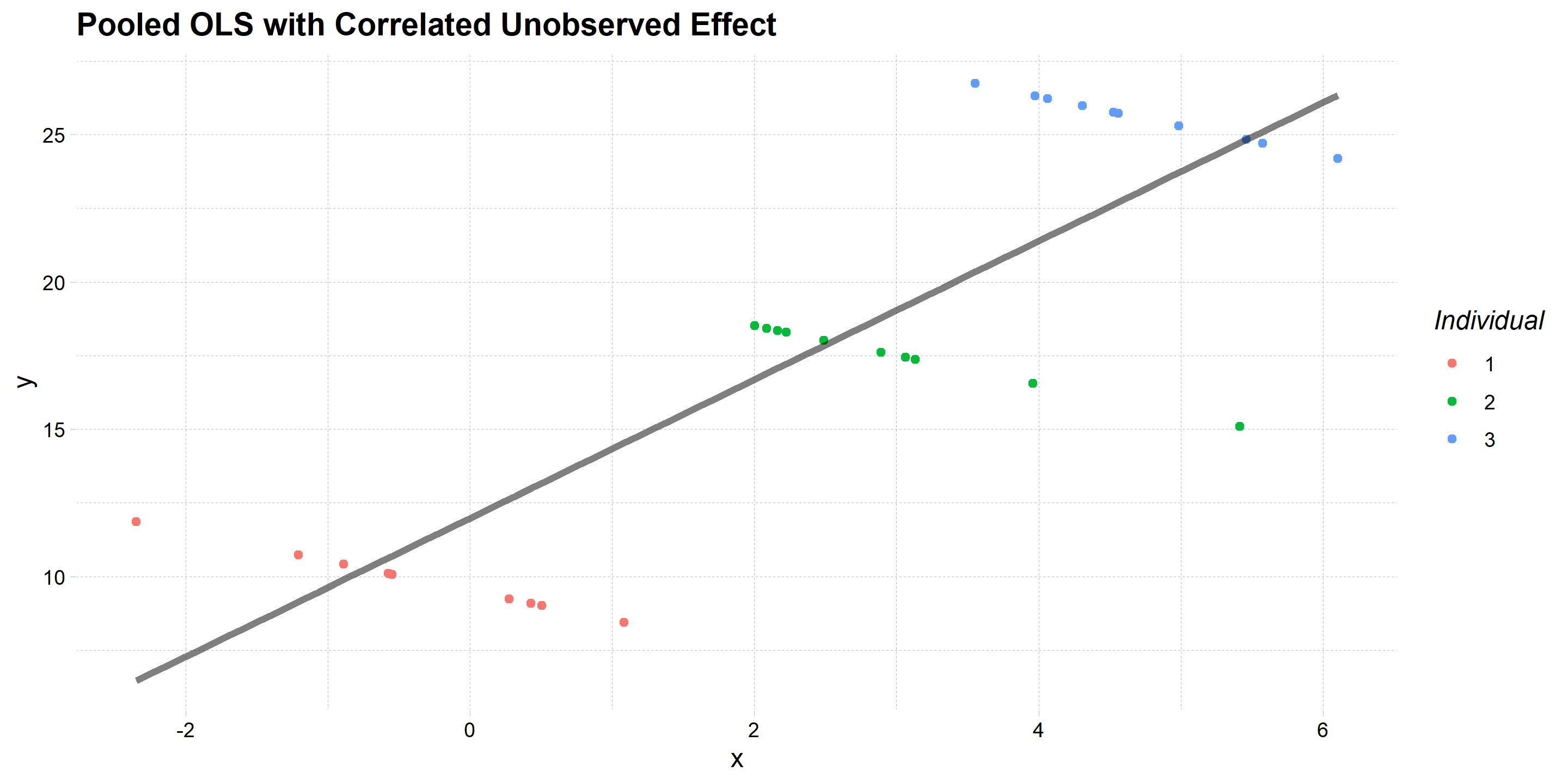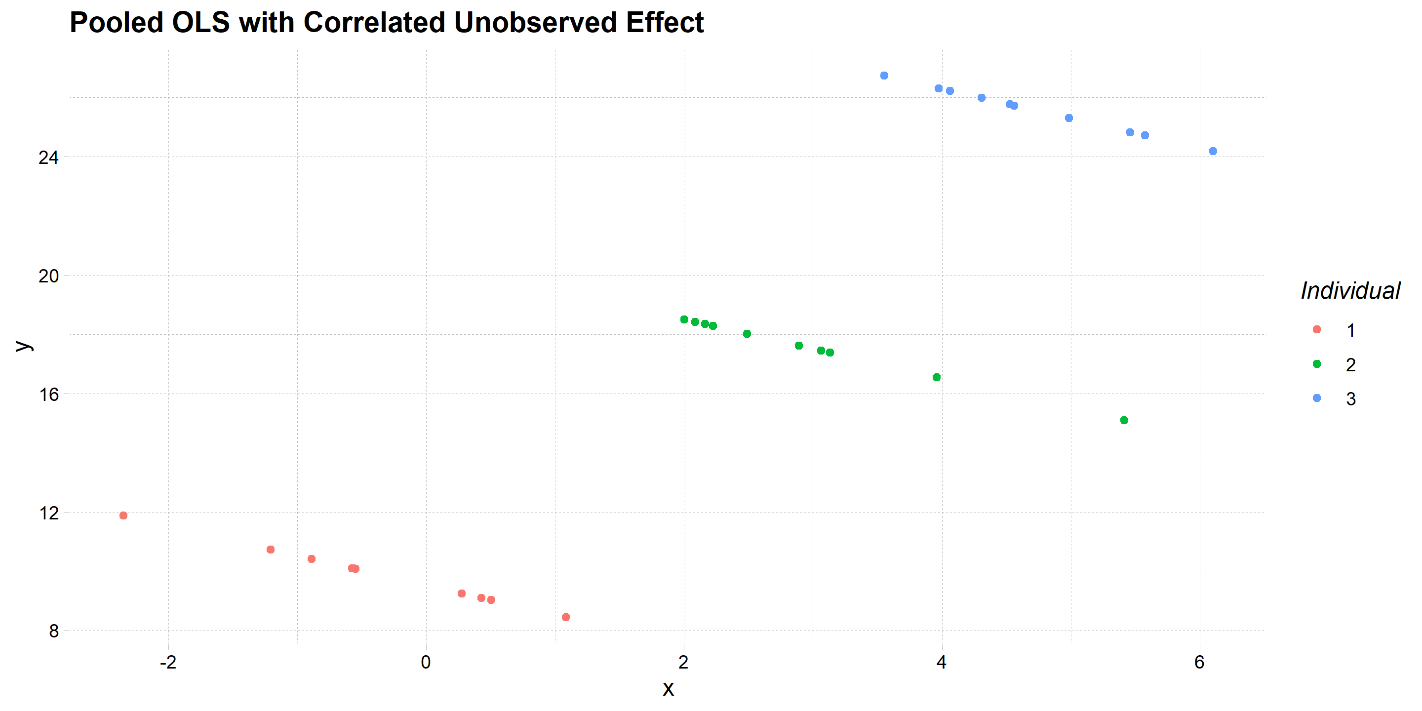 But there is an unobserved effect \(a_{i}\) that is positively correlated with \(x_{it}\)