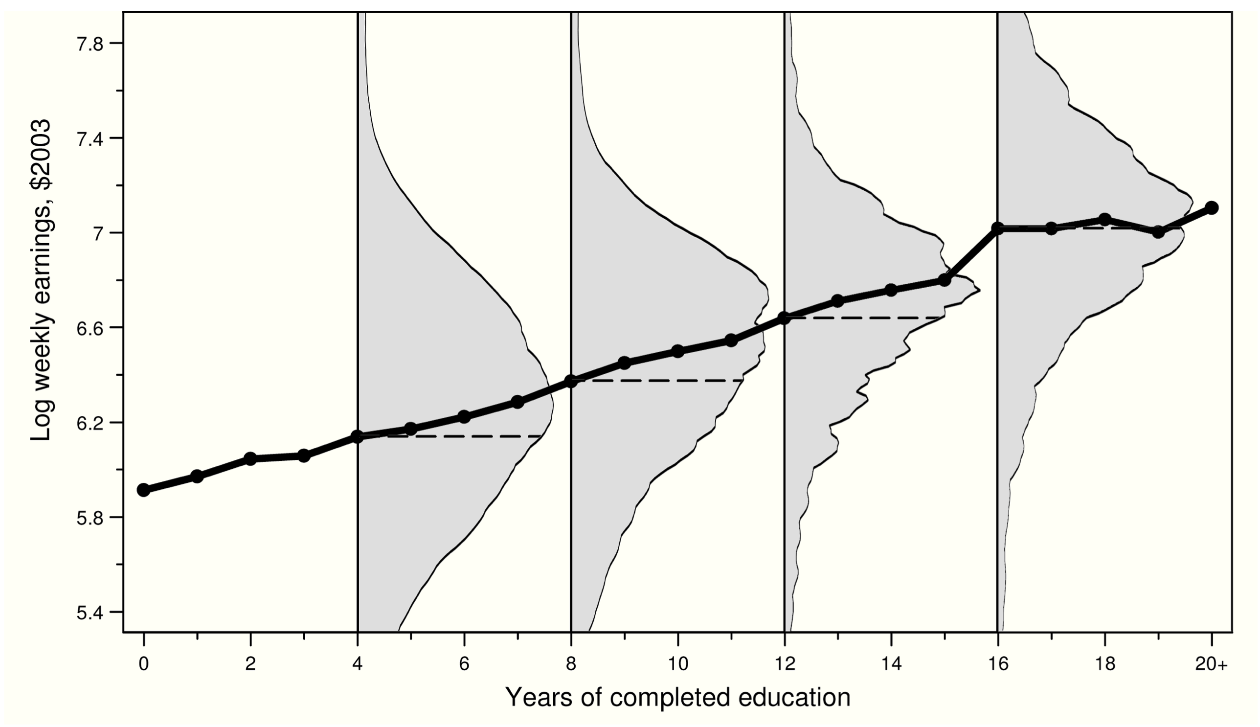 Grey shaded areas are distribution of log earnings at each level of schooling