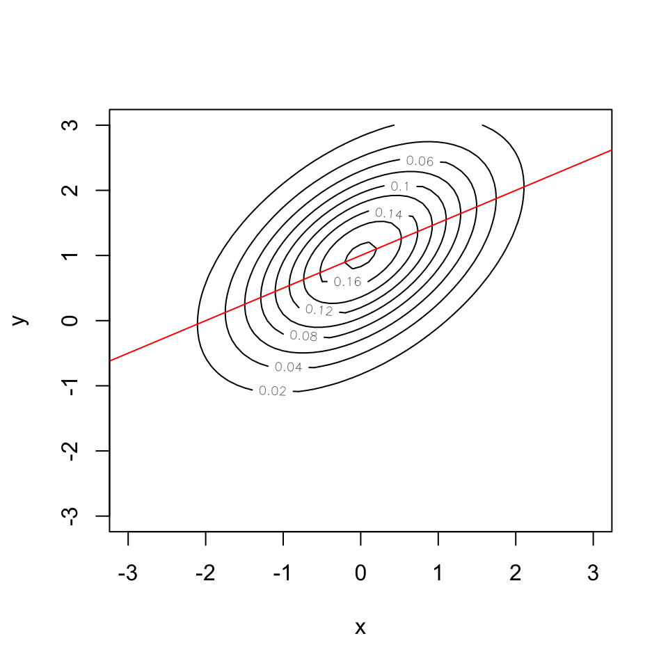 \[ E[y|x] = \mu_{y} + \rho \frac{\sigma_{y}}{\sigma_{x}}(x - \mu_{x}) \]